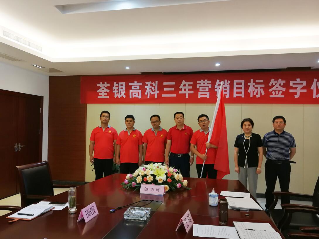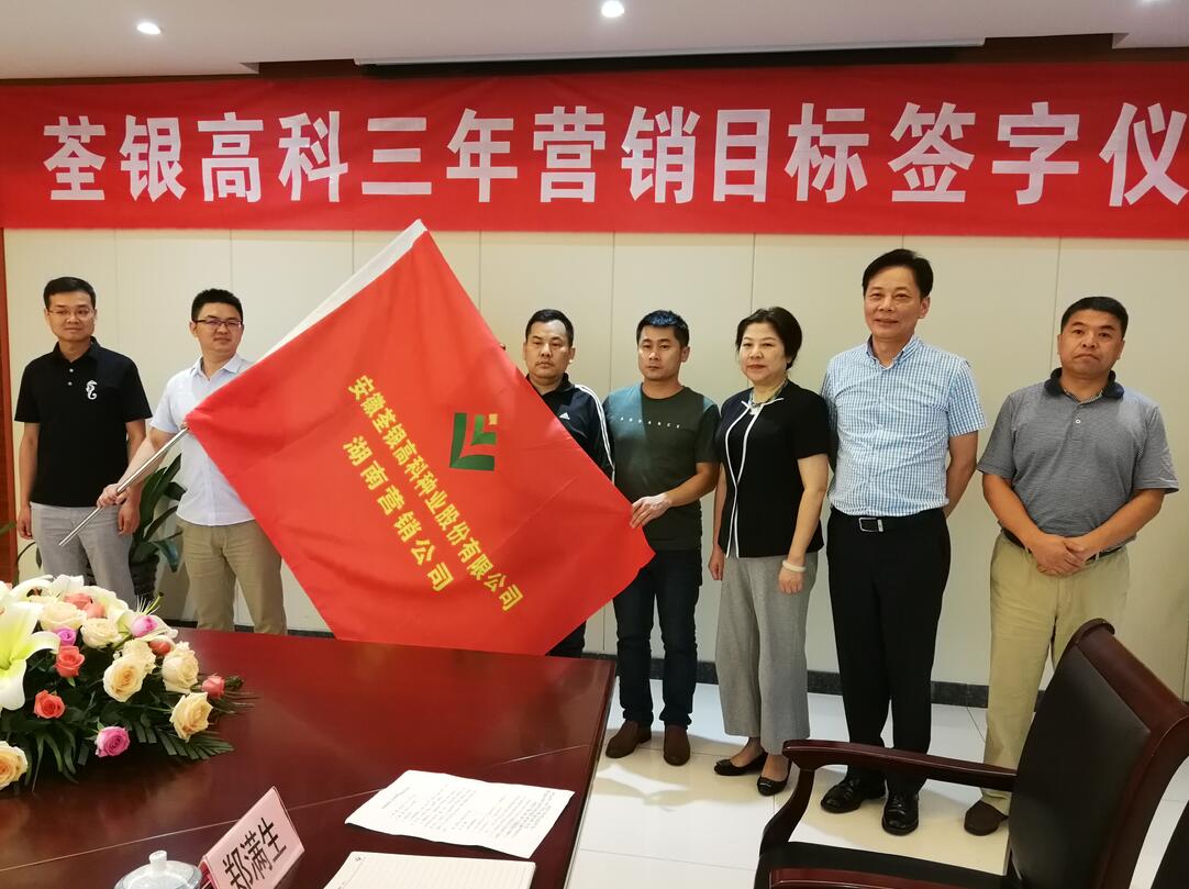 ????2018年7月11日上午,荃銀高科舉行三年營銷目標簽字暨授旗儀式,公司全體經營班子成員,總部各營銷公司、專業(yè)公司負責人及其團隊參加了此次簽字儀式。通過開展此次活動,有利于提高公司營銷能力,充分調動營銷人員積極性和主動性,實現責權利充分掛鉤,以適應當前新階段新形勢新任務,努力完成公司經營目標任務。